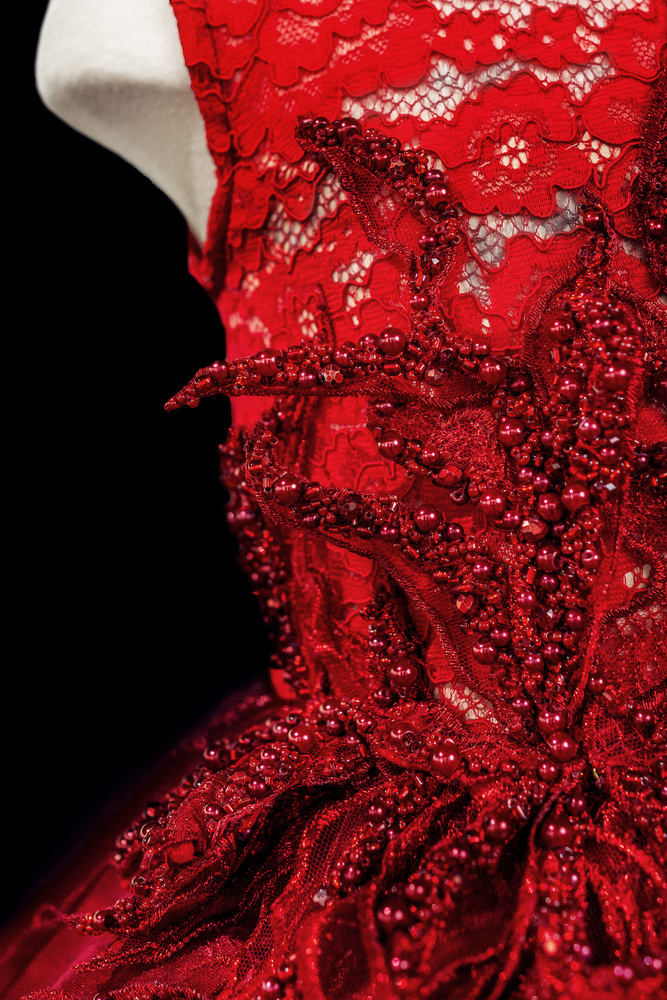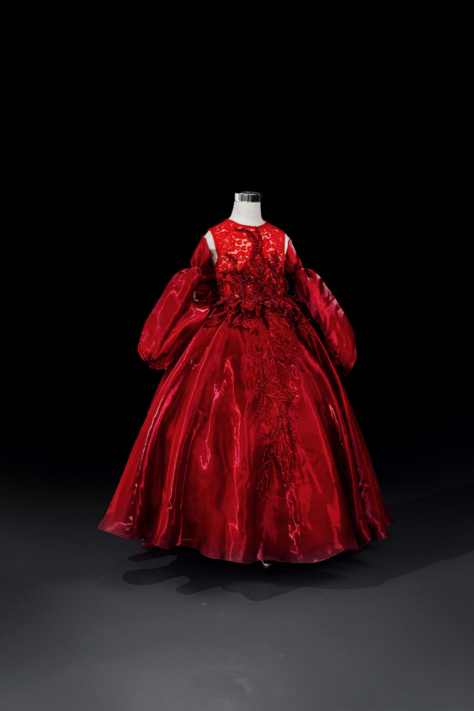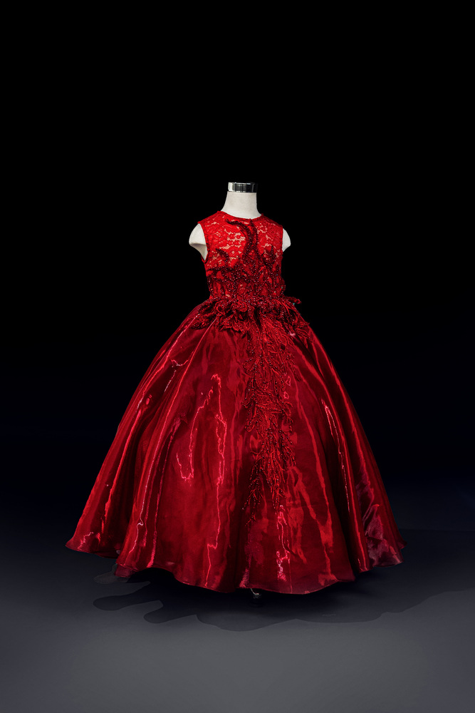 Crafted from lustrous velvet and detailed with hand-appliquéd embroidery and shimmering beads, this gown radiates strength, grace, and the bold spirit of a rising star.